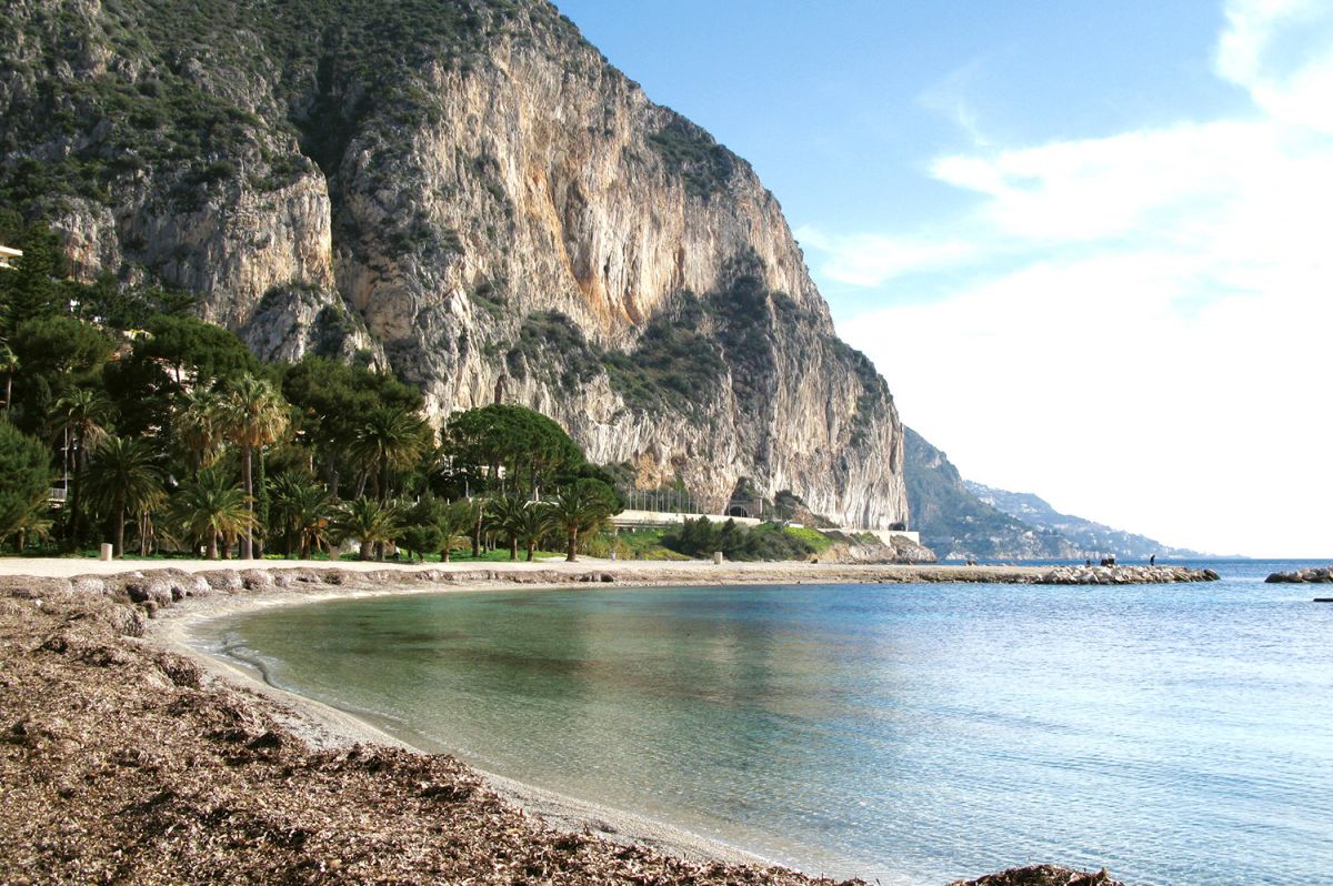 La Petite Afrique. Sie schmiegt sich an die Klippe und verläuft neben dem Yachthafen. Es ist ein größerer Strand, an dem Beachvolleyball gespielt werden kann